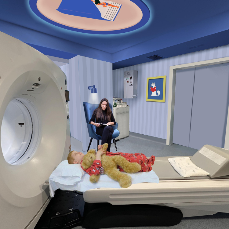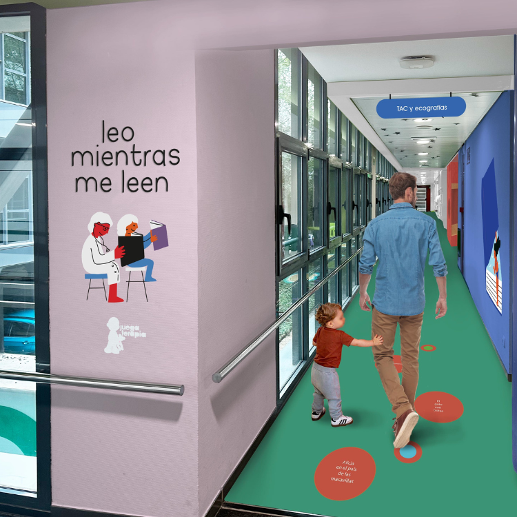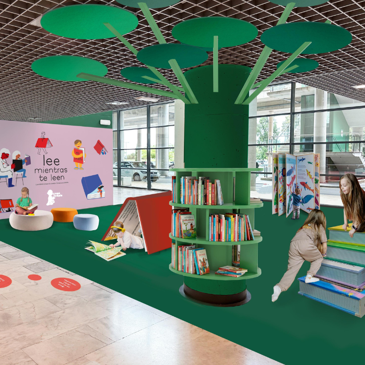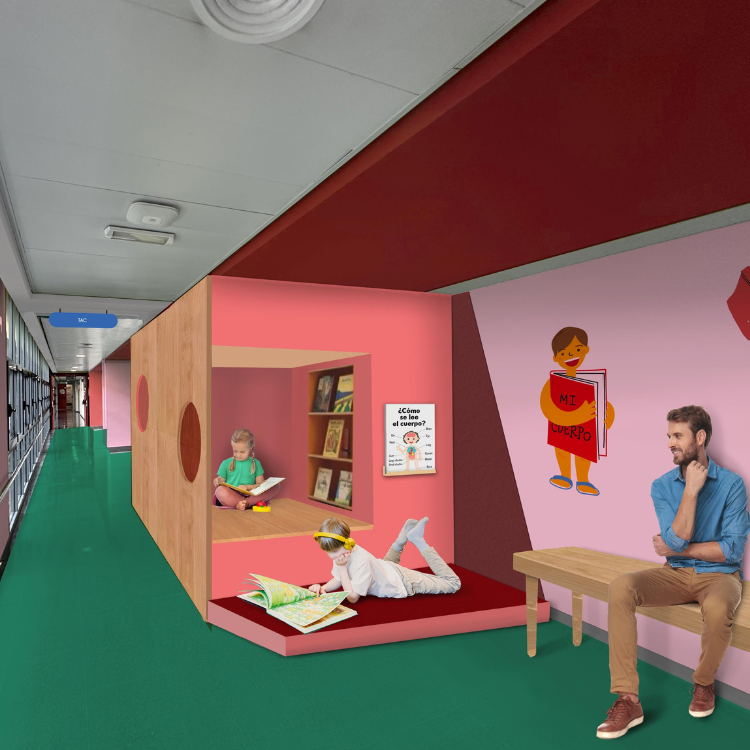 En las salas de espera y pasillos de la unidad construiremos unas bibliotecas, llenas de libros. El paciente elige un libro de alguna de estas casetas o estanterías a su disposición El paciente y su familia pueden informarse sobre la prueba leyendo ¿Cómo se lee el cuerpo humano? Una publicación que crearemos en la que se explica en qué consisten las pruebas radiológicas. La publicación estará expuesta en los puntos biblioteca.
